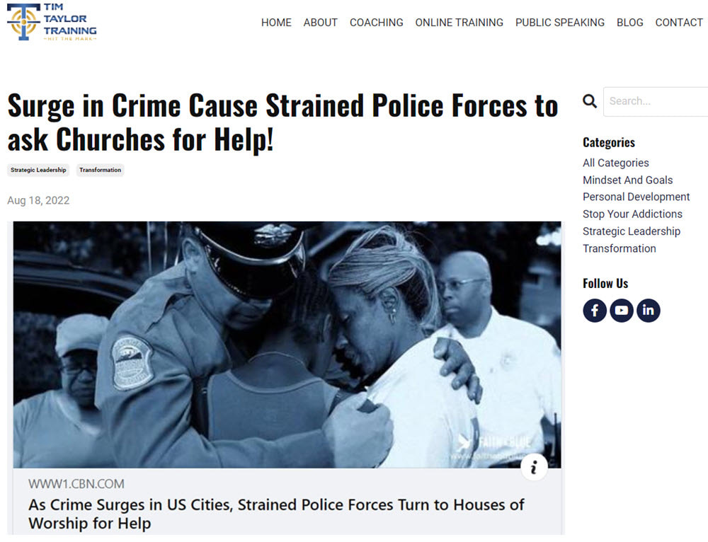 The picture above is from my new blog at Tim Taylor Training. During the event I’d made the point that the lawlessness of this day has presented the opportunity for the real Church to arise. Greg Daley, one of the ministers on my accountability council sent this CBN article to me this morning that provided the perfect frame work to present the strategy I’ve been pioneering for 30+ years. Check it out. Click here for Surge in Crime Causes Strained Police Departments to ask Churches for Help!